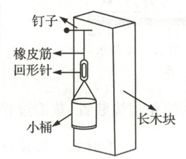 27 (3分)小明想知道家用酒精的密度,找到下列器材:钉子、长木块、橡皮筋、回形针、柱形透明塑料小桶、刻度尺、记号笔和足量的水。已知水的密度为$ \rho_0 $,家用酒精的密度比水的小。请利用器材完善以下步骤,帮助他设计一个测量家用酒精密度的方案。