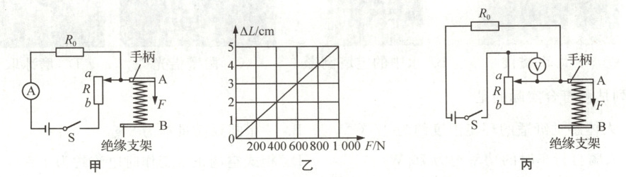 18 电子握力计的模拟电路如图甲所示,电源电压恒为$6\ {V}$,定值电阻$R_0 = 5\ {\Omega}$,手柄$A$与滑片固定在一起,长度为$5\ {cm}$的均匀金属棒$R$的总阻值为$25\ {\Omega}$,绝缘支架$B$固定不动,滑片可在$ab$之间滑动,当滑片处于$a$端时弹簧恰好处于原长,弹簧的形变量$\Delta L$与握力$F$的大小关系如图乙所示。握力计由电流表(量程为$0\sim0.6\ {A}$)改装而成,其表盘的零刻度应标在电流表表盘的