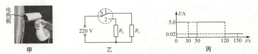 19 如图甲是家用手持熨烫机,其等效电路如图乙,$R_1$为加热电阻,$R_2$为限流电阻,$S$为自动温控开关,将熨烫机接入电路,$S$在位置“1”,电热板被加热,电路中电流为$5\ {A}$;当温度升到$130\ {^{\circ}C}$时,$S$切换到位置“2”,熨烫机处于待机状态,电路中电流为$0.02\ {A}$,当温度降到$100\ {^{\circ}C}$时,$S$又回到位置“1”。$R_1$的阻值为