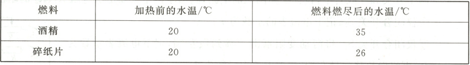 。(3)下表是实验乙中收集的数据,可得出两种燃料的热值之比为$q_{ 酒精}:q_{ 碎纸片} =$