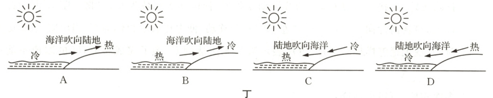 (填“水”或“沙子”)的吸热能力较强;如图丁所示,白天的海、陆风成因示意图正确的是A