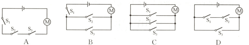 5 如图是小明家新买的智能门锁,它可以通过三种方式开锁(电动机M工作),输入密码(开关$ S_1$)、通过指纹(开关$ S_2$)或钥匙开门(开关$ S_3$),其等效电路图为 (