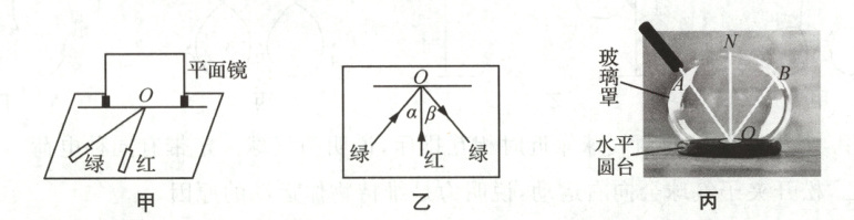 .小明的实验装置如图丙所示,他先用加湿器使整个玻璃罩内充满水雾,将平面镜放在一个能转动的水平圆台上,用固定的红色激光笔发出一束垂直射向平面镜的光NO,然后用另一支绿色激光笔向O点发出一束光AO,经平面镜反射后沿OB方向射出.