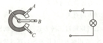 解析:逆时针旋转P旋片时,灯泡变暗,说明逆时针旋转时,电位器连人电路的电阻变大,故将AB两接线柱串联接入了电路,即将图中的AB接线柱与右侧电路中的两条导线相连.