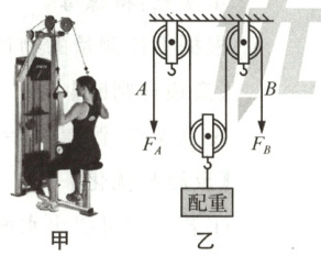 23 (6分)图甲是运动员训练背部及肩部力量时常用的高位下拉器,其简化装置如图乙所示.训练中,运动员两手分别从A、B端同时施加拉力将配重匀速提起20 cm,某次训练中的三组情况记录如下表.(g取10 N/kg),试求: