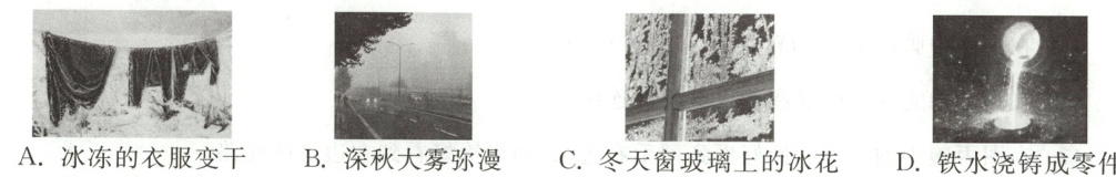 7C “雪”是空气中的水蒸气遇冷直接变成固态小冰晶形成的,这种物态变化是凝华,冰冻的衣服变干,冰直接变成水蒸气,是升华现象,故A错误;深秋大雾弥漫,雾是空气中的水蒸气遇冷液化形成的小水珠,是液化现象,故B错误;冬天窗玻璃上的冰花,是室内温度较高的水蒸气遇到温度很低的玻璃直接凝华形成的固态小冰晶,故C正确;铁水浇铸成零件,铁水由液态变成固态,是凝固现象,故D错误。