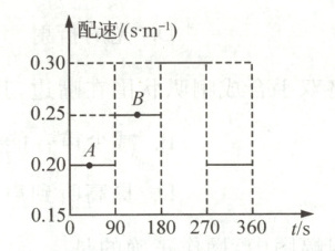 解析:根据题意知道,配速是指通过单位路程所需要的时间,由图像知道,小明在A点的配速是0.20s/m,即1m的路程用时0.20s,B点的配速是0.25s/m,即1m的路程用时0.25s。由此可知,小明在A点的速度大于B点的速度,即小明在A点的速度比B点的快。由图像知道,前90s的配速是0.2s/m,速度v = 1/0.2s/m = 5m/s,前90s运动的路程s = vt = 5m/s×90s = 450m,90~180s内的配速是0.25s/m,速度v′ = 1/0.25s/m = 4m/s,通过的路程为s′ = v′t′ = 4m/s×90s = 360m,0~180s内运动的路程s₍总₎= s + s′ = 450m + 360m = 810m,通过1000m所用的时间t₍总₎= t + t′ + t′′ = 90s + 90s+(1000m - 450m - 360m)/0.3s/m = 237s,故1000m内的平均配速为t₍总₎/s₍总₎= 237s/1000m = 0.237s·m⁻¹。