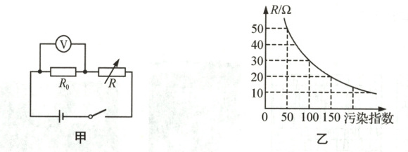 (3)根据欧姆定律求出电路中电流,根据串联电路的分压特点求出可变电阻两端电压,再根据欧姆定律求出可变电阻连入电路中的阻值,根据图像分析污染程度;