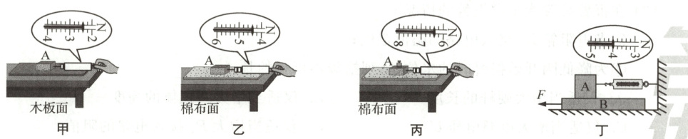 两图可知:接触面粗糙程度相同时,压力越大,滑动摩擦力越大.(3) 小明在实验后反思:操作中弹簧测力计的示数不稳定.小组其他同学提醒小明,将实验装置改成如图丁所示,拉动木板B,当物块A稳定时,弹簧测力计示数如图丁所示.