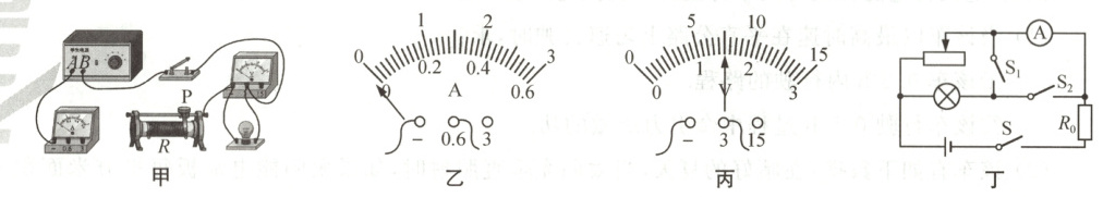 (5) 用图丁所示电路来测量另一只额定电压为4 V的小灯泡的额定功率.已知电源电压恒为6 V,定值电阻$R_0$的阻值为5 Ω.