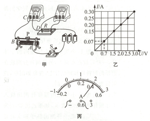 (4)将R换成5Ω,闭合开关,移动滑片P,电流表示数如图丙所示,电流表选用小量程,分度值0.02A,其示数为0.4A,则定值电阻两端电压为Uv = I2R2 = 0.4A×5Ω = 2V;由图乙可知,在探究电流与电压的关系实验中,定值电阻的阻值为$R1 = \frac{U_1}{I_1} = \frac{0.7V}{0.07A} = 10Ω,$故未使用过电阻的阻值为20Ω;在探究电流与电阻的关系实验中,应控制定值电阻两端电压不变,故换接20Ω的电阻,正确操作后,电流表示数应为$I3 = \frac{U_V}{R_3} = \frac{2V}{20Ω} = 0.1A.$