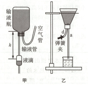 (1) 如图乙所示,锥形瓶中装有红色的水,a、d 管通过双孔软木塞插入瓶中,两管上方端口接近瓶口并齐平,a 管下端放入量杯,d 管下端套有橡胶软管,并用弹簧夹夹住,装置呈竖直放置. 此时,a 管下端管口无水流出,这是由于