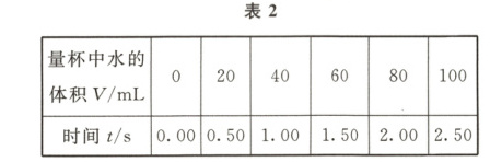 (2)①根据表格描点连线,如图所示.②由表格可知V和t成正比关系,即每秒钟从a管口流出的水量是定值V = 10mL = 10cm³;a管的底面积$S = π×(\frac{d}{2})² = 3.14×(\frac{0.3cm}{2})² ≈ 0.071cm²;a$管口处水流出的速度$v = \frac{V}{St} = \frac{10cm³}{0.071cm²×1s} = 140.8cm/s = 1.4m/s.$