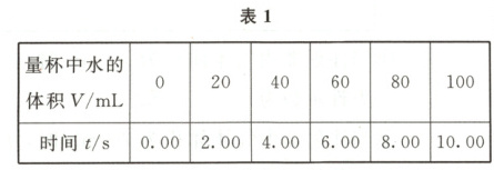 的作用.(2) 松开弹簧夹,水从 a 管口流出,用秒表测出量杯中的水分别达到 $20 mL $、$40 mL $、$60 mL $、$80 mL $、$100 mL $ 水位时的时间 $t$,记录在表 1 中.
