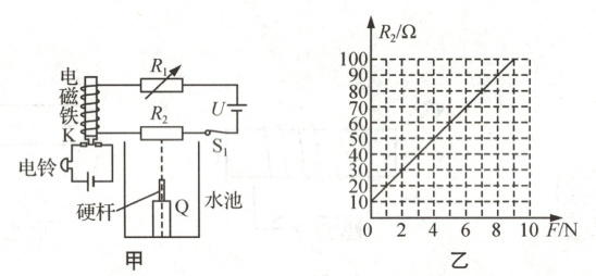 28 (10分)某水位报警模拟装置如图甲所示:浮子Q由圆柱体和硬杆构成,圆柱体的底面积$S=5×10^{-3} m^2$,高$H=0.2 m$,密度$ρ=0.6×10^3 kg/m^3$,硬杆的质量和体积均不计.Q只能沿图中竖直虚线运动.当向水池内缓慢注水使水位达到某处时,衔铁K被释放,电铃开始报警.已知:电源电压$U=6 V$,$R_1$为电阻箱,压敏电阻$R_2$的阻值与硬杆对其压力F的关系图线如图乙所示;当