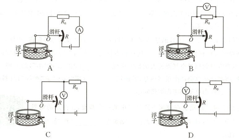 10 如图均是测定油箱内油量的装置.其中$R$是滑动变阻器的电阻片,滑动变阻器的滑片跟滑杆连接,可以从电阻片的最上端移到最下端.当油箱内的油量减少时,油量表示数随之减小;当油量为零时,油量表的零刻度与电表的零刻度重合.可以实现上述要求的是 (