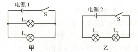 $\Omega$;如图乙所示,闭合开关,$ L_1$灯正常发光,则电源2的电压$U =$4.5