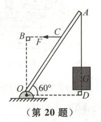 20 如图所示,$OA$是以$O$点为支点的轻质杠杆,杆长$2\ m$,水平拉力$F$作用在杠杆$C$点,$OC = 2AC$.$OA$与线段$OD$的夹角是$60^{\circ}$,$A$端吊起的物重$40\ N$,$BC$与力$F$的作用线重合,$OB \perp BC$、$OD \perp AD$.则拉力$F$的力臂长为
