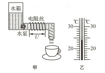 (2022 镇江)即热式饮水机工作原理如图甲所示,水箱中的水被水泵抽出后,流经电阻丝时被加热,实现边加热边出热水的即热功能,电阻丝最大加热功率为 $2000 W $. 用户可根据需要调节出水温度和出水量. 小军对该饮水机进行了探究.