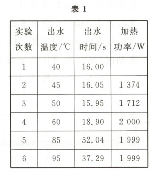 (2)实验中保持水的初温和出水量不变,改变出水温度,用到了控制变量法.由表1数据知当出水温度低于85℃时,仅通过改变加热功率来调节出水温度.由表1数据知当出水温度高于85℃时,加热功率不变,都为1999W,此时水吸收的热量Q吸' = c水mΔt' = 4.2×10³J/(kg·℃)×0.25kg×(88℃−24℃)= 6.72×10⁴J,由于无热量损失,所以加热器产生的热量W' = Q吸' = 6.72×10⁴J,由$P = \frac{W}{t}$得水时间$t' = \frac{W'}{P'} = \frac{6.72×10⁴J}{1999W} ≈ 33.6s.$