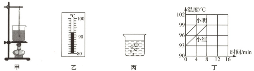(4)小明和小红选用相同的实验装置进行实验,他们绘制的温度随时间变化的图像如图丁所示,小红从加热到水沸腾,所用时间较长的原因是