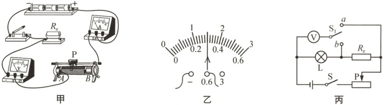 $ \Omega $。(4)小明又设计了如图丙所示的电路,也想测出同一定值电阻$ R_x $的阻值。已知小灯泡的额定电压$ U_{ 额} $和额定电流$ I_{ 额} $。请你完善以下实验步骤:
