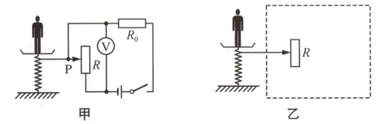 27 (5分)在开展“制作简易体重计”的跨学科实践活动中,物理小组设置了如下的评价量表,准备了:电压$ 12 \, V $的电源,最大阻值$ 30 \, \Omega $的滑动变阻器,量程$ 0 \sim 3 \, V $的电压表,多个阻值不同的定值电阻,开关和导线,一根弹簧,设计电路如图甲所示。