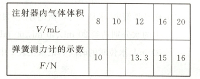 观察表中的数据可以发现:注射器内的气体变化为原来体积的2倍时,注射器内气体对活塞的压力减半,由上表可知,注射器内气体为20mL时注射器内气体对活塞的压力为4N,因此注射器内气体为10mL时注射器内气体对活塞的压力为8N,当注射器内气体体积为10mL时,弹簧测力计示数为F测力计 = 20N - 8N = 12N.②当注射器内气体体积为20mL时,弹簧测力计的示数为16N,外界大气压对活塞的压力为20N,则注射器内气体对活塞的压力为F内 = F大气压 - F测力计 = 20N−16N = 4N,由压强公式$p = \frac{F}{S}$可得,注射器内大气压为p内$ = \frac{F内}{S} = \frac{4N}{2×10^{-4}m²} = 2×10⁴Pa.$