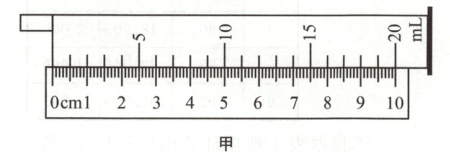 (1)如图甲所示,注射器刻度部分左端对准零刻线,右端对准10cm刻线,刻度尺的分度值为0.1cm = 1mm,刻度尺测出注射器刻度部分的长度l = 10.00cm;注射器的体积V = 20mL = 20cm³,则活塞的横截面积为$S = \frac{V}{l} = \frac{20cm³}{10cm} = 2cm².$
