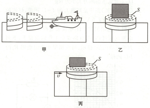 ①拖拽:如图甲所示,拖船拖拽两个“$C$”形组件,在江面匀速直线行驶$20 km$.抵达桥墩处、行驶过程中拖船的动力为$2.15×10^5 N$,柴油发动机动力系统的效率为$40\%$,$q_{柴油} = 4.3×10^7 J/kg$.