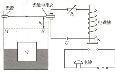 10. (2023 镇江)某水位报警器如图所示,光敏电阻$R$和光源正对安装在水池侧壁等高处.$R$接收到光源发出的光时阻值为$20 \Omega$,未接收到光时阻值为$120 \Omega$.$R_0$为电阻箱,$Q$为边长$5 cm$的正方体浮子,密度为$0.6 g/cm^3$,池内水面缓慢上升至某处时,浮子将挡住射向$R$的光线,报警铃声响起.当线圈中的电流$I \geq 0.04 A$时,铁质开关$K$被吸上,反之被释放.电源电压$U = 12 V$,不计线圈电阻,$g$取$10 N/kg$.