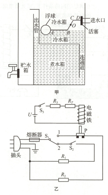 11. (2023 无锡)图甲是某型号电开水器结构简图,图乙是它的电路原理图,控制进水口的浮球阀由不锈钢浮球、绕$O$点转动的金属杆$ABC$、连杆$CD$、活塞组成.使用时,将插头插入家庭电路的插座中,电压为$220 V$. 冷水自进水口进入冷水箱,再经连通管进入煮水箱,当冷水箱水位达到设定高度,浮球浮起,$AB$水平,连杆$CD$水平向右推动活塞堵住进水口,停止进水,同时开关$S_2$闭合,开关$S_1$与触点 2 接通,煮水箱中的电热管$R_1$工作,额定煮水功率为$3300 W$,水沸腾后经出水管溢入贮水箱,冷水再补充入煮水箱,冷水箱中水位下降,进水口打开进水,同时$S_2$断开,重复上述过程,至贮水箱中注满水后,开关$S_1$与触点 1 接通,贮水箱中的电热管$R_2$工作,进行保温,额定保温功率为$660 W$.保温时,$S_3$同时接通,当电磁铁线圈中的电流达到$0.02 A$,衔铁$P$被吸起(开关断开);当电磁铁线圈中电流减小到$0.01 A$,衔铁$P$被释放(开关重新接通),使贮水箱内热水温度维持在$90∼95° C$.$R_3$是定值电阻.$R_T$是热敏电阻,其温度与贮水箱内水温相同,温度每升高$1° C$,电阻减小$100 \Omega$,电磁铁线圈的电阻忽略不计.$[c_{水} = 4.2×10^3 J/(kg · ° C)$,$\rho_{水} = 1.0×10^3 kg/m^3$,$g$取$10 N/kg]$