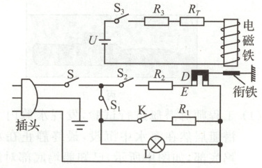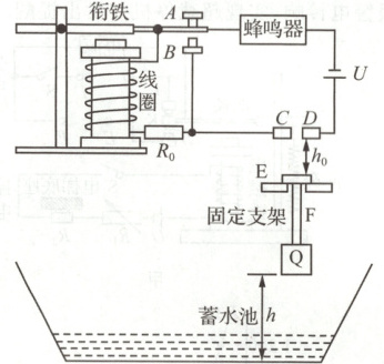 (1)当水位上升到一定高度时E与C、D接触,电路接通,电磁铁开始工作,衔铁被吸下来与B点接触,$R_0$及线圈被短路,蜂鸣器开始报警.