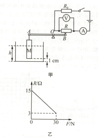 图甲所示是一种自动测定水箱内水面高度的装置. 电源电压恒为 $ 4.5\ V $,电流表的量程为 $ 0 \sim 0.6\ A $,电压表的量程为 $ 0 \sim 3\ V $,$ R_0 $ 是定值电阻,$ R $ 是压力传感器. $ R $ 的位置固定不动,其电阻随压力的变化关系如图乙所示. 杠杆 $ AB $ 可绕 $ O $ 点转动,$ A $ 端悬挂一重为 $ 15\ N $ 的圆柱体 $ M $,$ M $ 的底面积为 $ 45\ cm^2 $,高为 $ 30\ cm $,下底面距离容器底 $ 1\ cm $,杆 $ B $ 端始终压在传感器 $ R $ 上. $ AO $ 长 $ 30\ cm $,$ OB $ 长 $ 15\ cm $,杆重忽略不计,杆始终静止在水平位置. ($ \rho_{ 水} = 1.0 × 10^3\ kg/m^3 $,$ g $ 取 $ 10\ N/kg $)