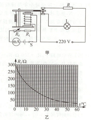 任务二:设计温控系统. 温控系统原理如图甲,控制电路的电源电压为 6 V,电阻箱 $R_0$ 的阻值调为 $90 \Omega$,热敏电阻 $R_1$ 的阻值随温度的变化图像如图乙.当控制电路中的电流达到 30 mA 时,衔铁被吸下:当电流降低到 25 mA 时,衔铁被弹回.已知工作电路中电热丝 $R$ 的电阻为 $22 \Omega$,浴霸灯 L 标有“220 V 275 W”字样.