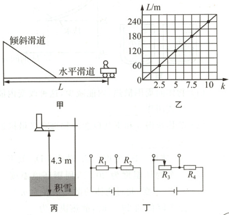 冰雪梯是很刺激的游乐项目,图甲为冰雪梯示意图.小华发现,选用不同材料的滑板,从倾斜滑道顶端由静止滑下后,沿滑道运动的水平方向总距离 $L$ 不同,设滑板对水平滑道压力和滑板所受阻力的比值为 $k$,已知 $L$ 的大小随 $k$ 值的变化关系如图乙所示.