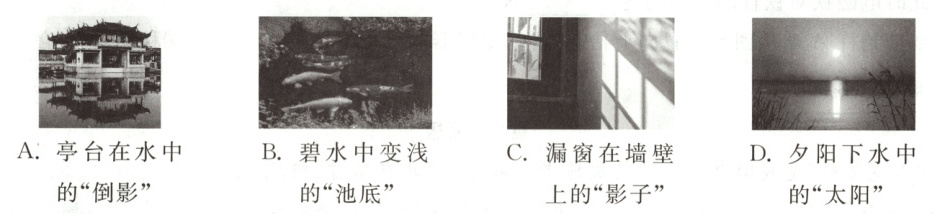 4 B 平静的水面相当于平面镜,亭台在水中形成倒影,是平面镜成像现象,是由于光的反射形成的,故A错误;池底看起来比实际浅是光的折射形成的,故B正确;墙壁上的影子的形成说明光是沿直线传播的,由于光的直线传播,被物体挡住后,物体后面就会呈现出阴影区域,就是影子,故C错误;平静的水面相当于平面镜,太阳在水中形成倒影,是平面镜成像现象,是由于光的反射形成的,故D错误。