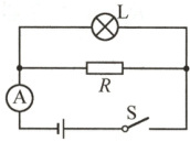 (2)闭合开关S,灯泡、电阻并联,电流表测干路的电流,灯泡正常发光,灯的电压为6V,即电源电压,通过灯的电流为0.5A,电流表示数为1.5A,由并联电路电流的规律可知,通过R的电流为$I_R=I_{总}-I_L=1.5A-0.5A=1A$,电阻R的电功率$P=UI_R=6V×1A=6W$。 (1分)