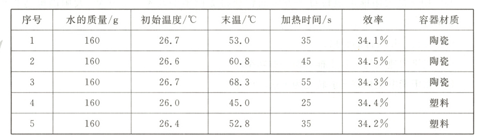 (4)分析实验序号1和5可知,用陶瓷和塑料盛质量相同的水,用相同功率的微波炉加热相同的时间,效率近乎相同,故微波炉的效率与容器的材质无关。