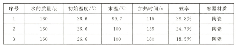 (4)小明用不同材质的容器盛水,将微波炉设定相同的功率加热,完成多次实验,实验数据记录 如下: