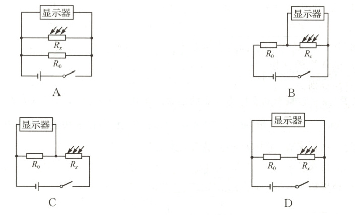 10 某兴趣小组想设计一种能自动测定光照强度的装置,当光照强度增强时,光敏电阻$R_{x}$阻值变小,光照强度显示器(由电压表改装而成)示数增大,反之示数减小。若电源电压不变,$R_{0}$是定值电阻,则下列设计的电路图中符合要求的是(