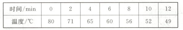 解析:她将一杯100mL的热水放在室温下自然冷却,此过程是通过热传递的方式改变水的内能;100mL的热水质量为$m=ρ_{水}V=1.0×10³kg/m³×100×10^{-6}m³=0.1kg;$在前6min内,水放出的热量为$Q_{放}=cm(t - t_{0})=4.2×10³J/(kg·℃)×0.1kg×(80℃ - 60℃)=8.4×10³J.$水的内能减少了8.4×10³J.分析表中数据可知,热水冷却过程温度变化的特点是先快后慢.