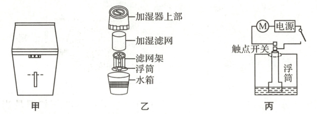22 (10分)加湿器可以增加室内空气湿度,如图甲是某蒸发型加湿器。它是采用蒸发原理加湿的,其内部结构如图乙所示。加湿器上部有一个小型风扇,还有电源、时间、风速、湿度设定等按键。加湿器下部有三部分装置,分别是加湿滤网、滤网架(含浮筒)和水箱。加湿滤网安装在滤网架上,加湿滤网呈蜂窝状,放入水箱后,水会布满整个滤网。