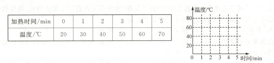 (2)在探究水吸收的热量与水升高的温度之间的关系时,小华量取0.8 kg水,用电热水壶加热,每隔1 min测量一次水的温度.测得数据如下表所示.请在坐标图中画出水的温度随加热时间变化的图像.