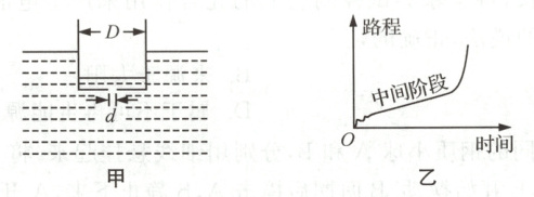 为了探究计时碗下沉时间的影响因素,研究人员制作了一个圆筒形的计时碗,碗壁很薄,碗口直径为D,碗底中心小孔直径为d.如图甲所示,从碗放在水面上开始计时,记录不同时间碗底下沉的距离,得到碗下沉过程中路程—时间关系图像如图乙所示.