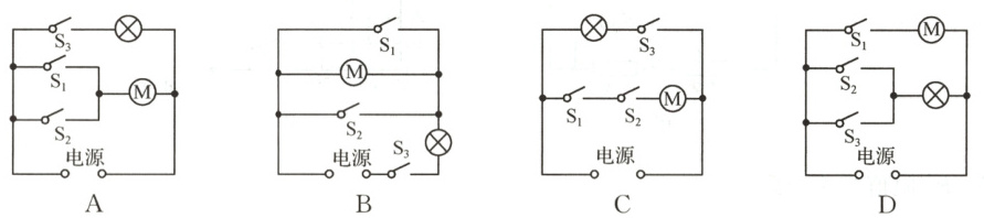 8 跨学科实践活动中,学习小组为某居民小区设计“图书自动借阅机”,通过刷卡(相当于闭合开关 $S_1$)或人脸识别(相当于闭合开关 $S_2$)都可以使电动机工作,完成借阅服务;当天黑时,光控开关 $S_3$闭合还可以提供照明.下列电路符合设计要求的是
