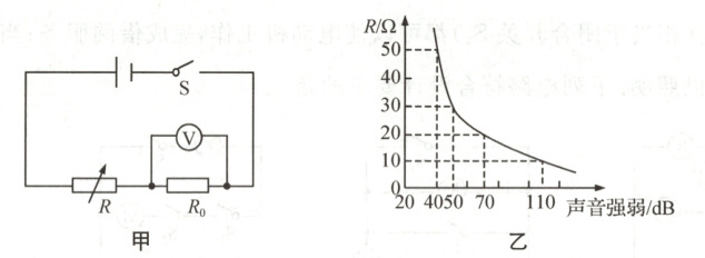 12 噪声是污染环境的公害之一.某科技小组为了监测噪声的强弱,用学生电源、电压表、定值电阻 $R_0$、声敏电阻 $R$ 等实验器材进行探究,设计如图甲所示电路.其中 $R$ 的阻值随声音强弱变化如