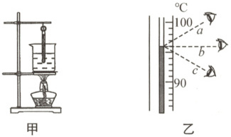 (2)开始实验,在温度升高到90 $^{\circ}C$后,每隔1 min记录一次温度,第3 min时温度计示数如图乙所示,读数时,视线应沿