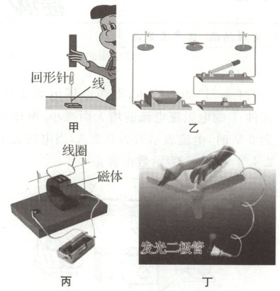 8A 磁体的周围存在磁场,磁场的性质是对放入其中的磁体有力的作用,图甲中磁铁通过磁场对回形针施加力,A正确;图乙是奥斯特实验,说明电流的周围存在磁场,B错误;图丙是磁场对通电导体有力的作用,使得线圈转动,是电动机的原理,C错误;图丁中转动扇叶会使得发光二极管发光,说明产生了电流,是电磁感应原理,D错误.
