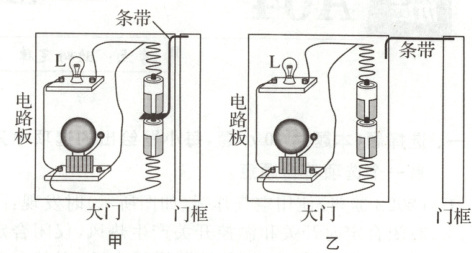 11. (2022 常州)某综合实践小组自制如图甲所示的开门报警器,电路板固定于大门,条带左端插在两电池之间,右端固定于门框.如图乙所示,大门一旦被打开,灯亮、电铃响.条带在电路中起到了电路元件